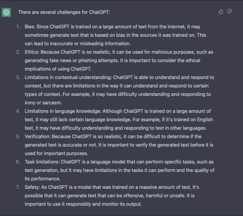 En inderdaad men heeft beperkingen vastgesteld in zijn trainingsgegevens. ChatGPT heeft zelfs vooringenomenheid getoond als het gaat om het trainen van datagroepen van minderheden. Daarom is het belangrijk om de gegevenstransparantie van de modellen te verbeteren om vertekening in deze technologie te verminderen. Omdat ChatGTP een vrij recente technologie is, heeft het nog niet voldoende feedback gekregen van zijn gebruikers. Hierdoor kan het zijn dat je de verkeerde informatie terugkrijgt. Services zoals StackOverflow hebben ChatGPT verbannen van hun website. Omdat zij vinden dat de foutenmarge nog te hoog ligt. En dat zou nefast zijn voor hun gebruikers.