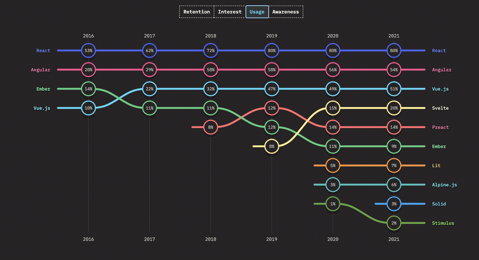 Even terug naar de basis. Elke frontend ontwikkelaar heeft al eens iets gehoord over React. Een Javascript library om gemakkelijk en efficiënt user interfaces te bouwen. Het is uiteindelijk nog steeds de meest gebruikte frontend tool volgens de 2021 “State of JS” ranglijst.