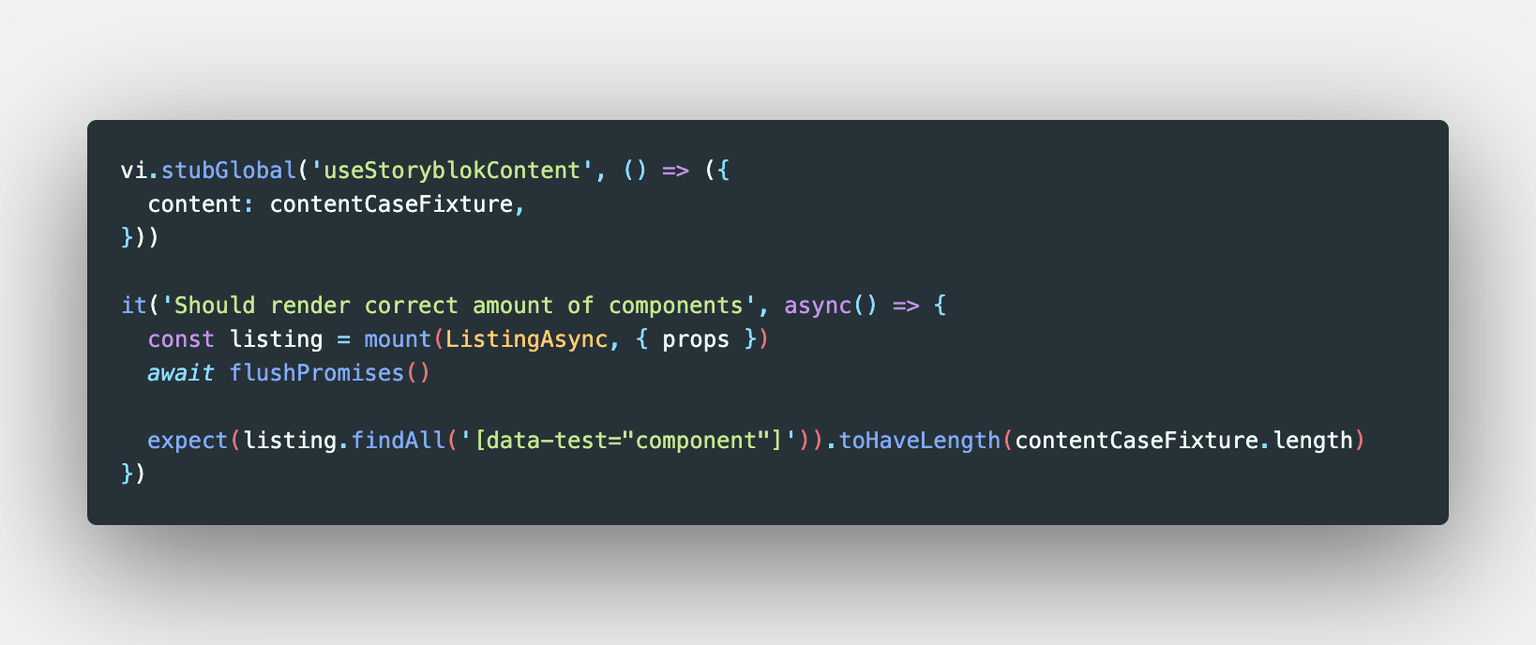 Je ziet dat wij het zelfde doen als daarnet om ons component te mounten alleen doen wij er een flushPromises() functie achter van Vue test utils en die zorgt ervoor dat eerst alle async functies in onze script tag gaan geresolved worden. Dit zou perfect werken maar herinner je dat ik net heb gezegd dat we snel willen gaan. 🏎️