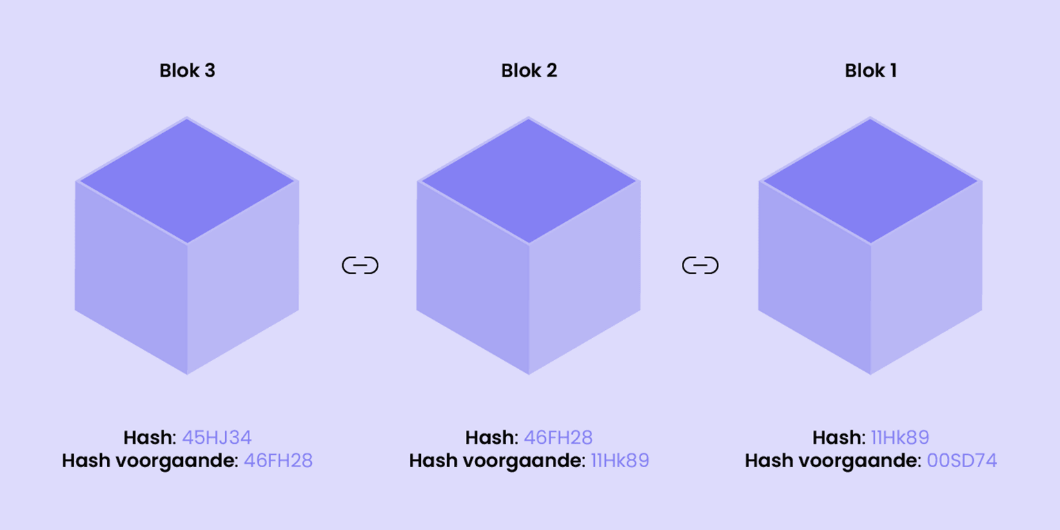 Blockchain is een veilig soort type ledger. Wat dit uniek maakt is het feit dat hij de transacties opslaat in, je raad het al, blokken. In deze blokken zit dan de data zoals de schenker, de ontvanger, de hoeveelheid, ... en de belangrijkste informatie van allemaal: een hash en een link naar de hash naar de vorige blok. De blok die de info van de vorige transactie bijhoud. Het idee waarop deze blockchain-technologie steunt is het feit als een transactie (blok) veranderd, zal de hash ook veranderen.