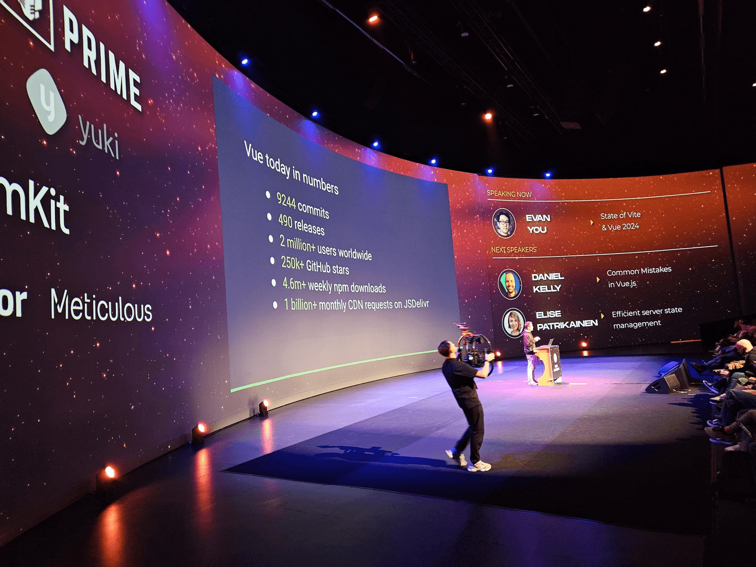 Het gebruik van Vue 3 is het afgelopen jaar met 73% gestegen en vormt nu meer dan de helft van alle Vue-installaties. In december 2023 werd versie 3.4 uitgebracht met een dubbel zo snelle parser, een efficiënter reactiviteitssysteem, een stabiele defineModel en v-bind same-name shorthand. In de toekomst zullen er nog meer verbeteringen in reactiviteit komen. -56% geheugengebruik en 10x verbetering met grote reactieve arrays zijn enkele van de zaken die klaar staan. Er komen ook verbeteringen in Server Side Rendering (SSR): Lazy Hydration, Stabilize Suspense en useId.